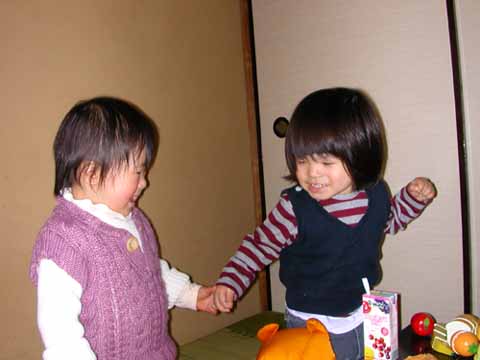 ![]() 2005/2/4(Fri) 今日は、少し遠くに住んでいるママ友達が子連れで遊びにきてくれました。彼女とは母親学級からのお付き合い。そして、ただいま臨月♪今月末には可愛い赤ちゃんが生まれることでしょう。 もうじき2歳になるこの男の子は、ペロが1ヶ月のときからのお付き合い。ペロよりちょうど2ヶ月早く生まれています。 ![]() ペロ1ヶ月、男の子3ヶ月 ところで、ペロが他の子と遊ぶところをみたことがありません。まだ、そういう年じゃないんだろうな、と思っていたら、児童館でも公園でも友達と遊ぶ子がいました。じゃ、ペロの性格なんだろうな、、、と、思っていたら、、、。 この男の子と遊びました!! ナンゴで会話をしていました。しまじろうは、ナンゴで正しく発音すると「アータイ」らしいです。ぬいぐるみの取り合いもしました。ペロは基本的に全てのおもちゃの所有権を主張していました。ペロの「どっじょ(どうぞ)」は「どうぞってあなたが言いなさいよ。」です。男の子は、ペロより月齢が上なだけあって、時々おもちゃを貸してくれます。「ありがとうは?」とペロにいうと、ふたりで「あっとぉ」と言います。時々貸してもらっているくせに、男の子がおもちゃを貸してほしそうにすると、ペロは、男の子の頭をポンポンと叩いて「ねんね。」と言ったり、男の子の手を握って気をそらさせようとしていました。 男の子がおどけて、「クシュンクシュン」とくしゃみをすると、ふたりでケラケラ笑います。おでことおでこをつき合わせたり、ふたりで抱き合ったり、そして、自発的に手をつないでキャーキャーはしゃぎました。 ![]() ペロ1歳9ヶ月、男の子1歳11ヶ月 この男の子は、体力も力もあります。男の子の前では、ペロが女の子にみえました(笑)。男の子は愛嬌もあって、わたしに抱きついてくれました。そしたら、ペロがやきもちを焼いてくれました。うれしーよー。 帰り道では、こどもふたりと手をつなぎました。ふたりともずっとナンゴで好き勝手言っていました。これも幸せだったけど、途中からの、しほ、ペロ、男の子、友達、全員で手をつないで歩いたときは、もっと幸せになりました。ペロと男の子が手をつなぐ姿って本当に可愛い。 駅の改札。 ベビーカーに乗る男の子にペロは「だっきー(大好き)」と自発的に言いました。改札の向こう側に行くと、ペロは泣き伏しました。さちが広島に帰るときよりしつこかったです(笑)。 ふたりの可愛さもさることながら、このペロの男の子に対する反応は本当に嬉しかったです。ペロの成長に関しては、夫婦でいろいろと気をもんでいました。帰宅したひろぼーに話すと、会社を休んででもその様子を見たかった、と言い出さんばかりでした。シャンパンをあけたいほどの出来事でした。 |